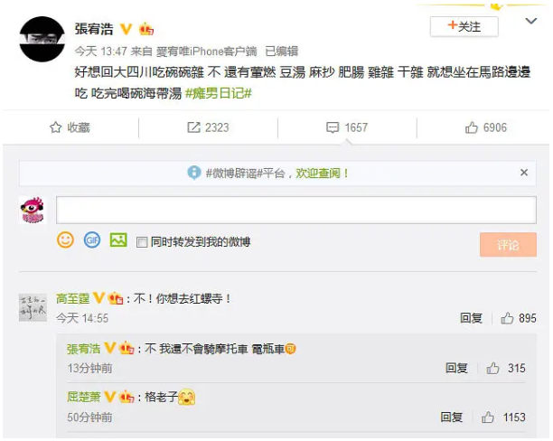 在最近发生在屈的事件中,张友浩和高志亭也卷入其中。在张友浩怀念川菜的微博下,他们三个在评论区不恰当地一起摇头,被网友diss“捆绑”。
