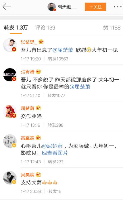 “谁有新戏,谁就是儿子”的互失是F4表达友谊的一种方式。就像屈的《漂泊的大地》发行前一样,每个人都蜂拥到老师的评论区来刷“我的儿子取得了很大的成就”。