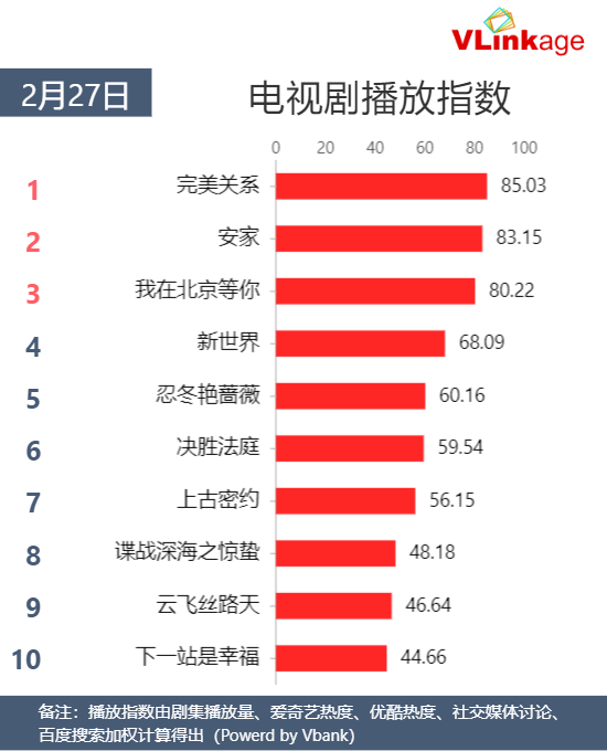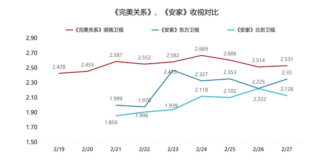 《完美关系》自2月18日登陆湖南卫视以来,CSM59城收视率破2,一路高开高走坐稳收视率榜单。与之相比,自2月21日登陆东方、北京卫视双台联播的《安家》,开播前三天收视率不敌《完美关系》,但大有迎头赶上之趋势,东方卫视CSM59城收视集均排名2-3名,北京卫视略微靠后,竞争进入胶着状态。