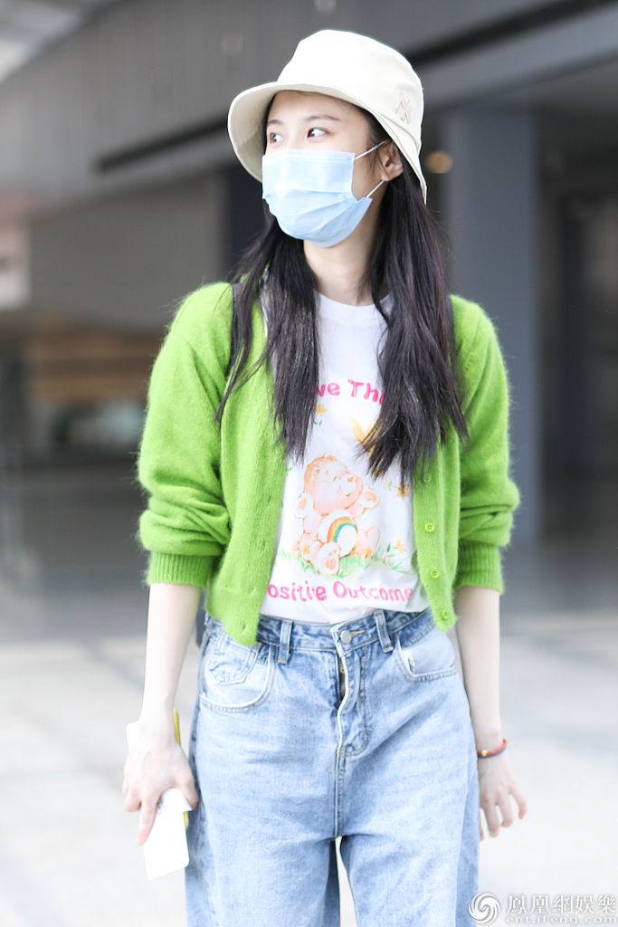 张慧文穿着亮绿色的针织衫和牛仔裤。