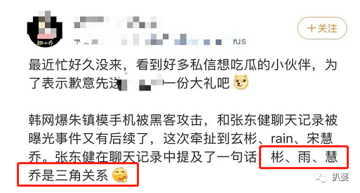 在他泄露的聊天记录中,他拿出了一个属于炳轩、宋慧乔和雨的旧三角瓜。
