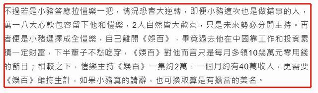 或者小猪100%放弃主持娱乐节目来帮助凯勒,依靠他出道以来20多年积累的财富,转而从事幕后工作,或者专注于发展时尚品牌业务。他的余生将有充足的食物和衣服。对他来说,这个项目意味着每个月拿几万元的零花钱。另一方面,凯勒必须靠每月40万新台币(约9.5万元人民币)的工资来维持生计。