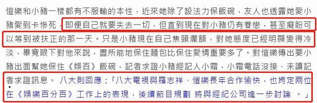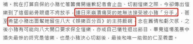 凯勒的“情妇”身份被揭露后,她的形象崩溃,工作收入直线下降。然而,罗志祥想在这个节骨眼上和她分手。台湾媒体报道称,凯勒听到此事后拒绝放手。在过去的几天里,她崩溃了,痛哭流涕,无法接受被小猪分开。她甚至希望他能站出来帮她保住娱乐节目主持人的工作。
