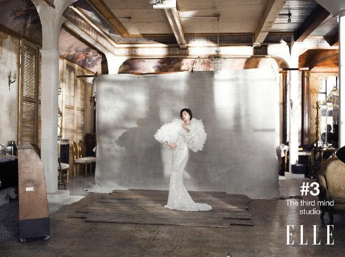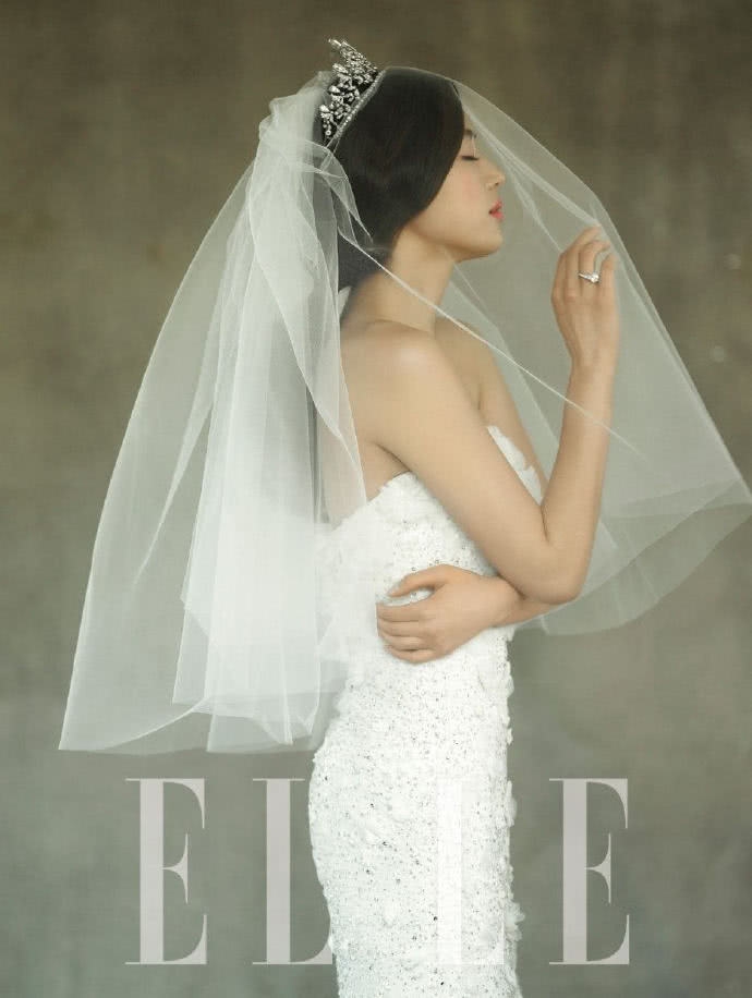 大片中,她身披各式婚纱,时而清纯时而妩媚。