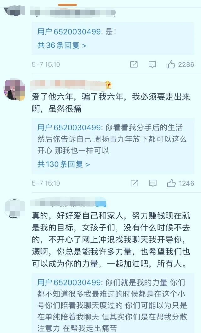 在最痛苦的时候,周扬青整晚都在和网友聊天。闲聊之后,她走出了阴霾。在她目前的状态下,她说她已经放下了,每天都过得很开心。