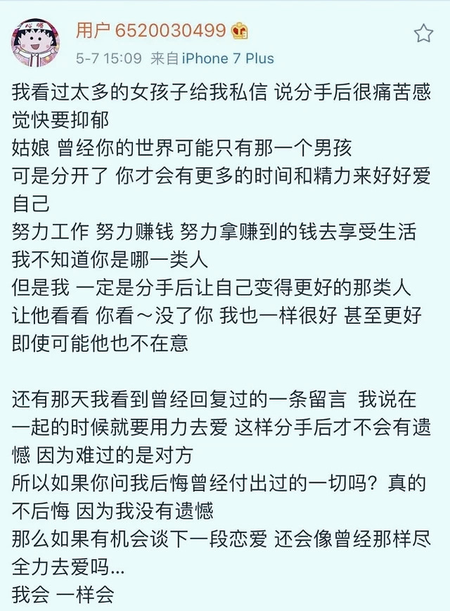5月7日中午,周扬青发表了一篇关于小号的长篇文章,谈论如何摆脱分手后的痛苦。