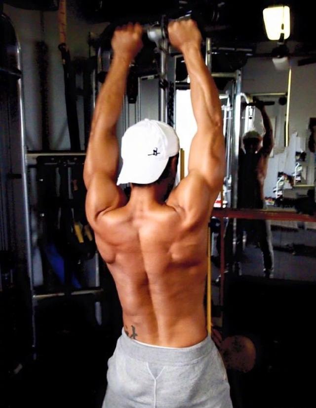 甄子丹背对着摄像机,把手放在健身器材上。他大胳膊上的肌肉非常强壮,他的身体几乎没有脂肪。仅仅看着他的背就让他感到充满力量。