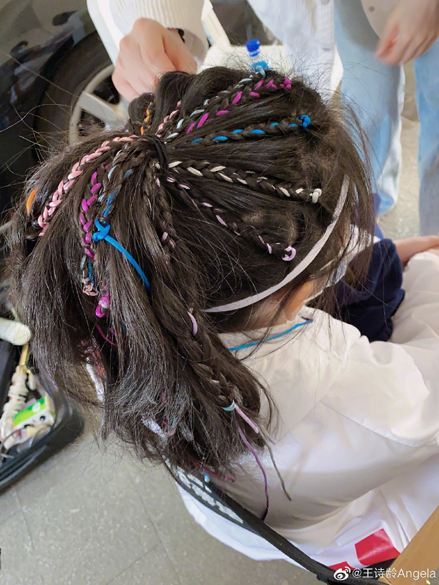 在照片中,王诗龄坐在一把小椅子上,头上扎着小辫子,上面系着丝带。一名化妆师正在整理王诗龄的头发。他看起来很专业。这是一则广告。
