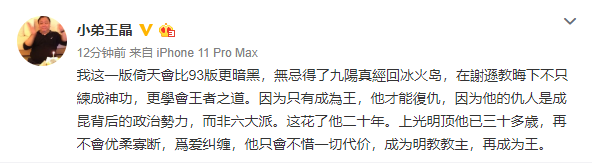 后来,王晶又发表了一篇文章,揭露了《新倚天》的情节梗概,说新版比93版更黑暗,张无极不再优柔寡断。相反,他将不惜一切代价为自己报仇:“我对天堂的依赖版本将比93版本更黑暗,无忌获得了九阳真经,回到了冰火岛。在谢逊的指导下,他不仅发展了魔法技能,还学会了如何成为国王。因为他只有成为国王才能复仇,因为他的敌人是成昆背后的政治力量,而不是六大派系。他花了20年时间。他已经30多岁了,不再优柔寡断。为了爱情,他只会不惜一切代价成为琐罗亚斯德教的领袖和国王。”