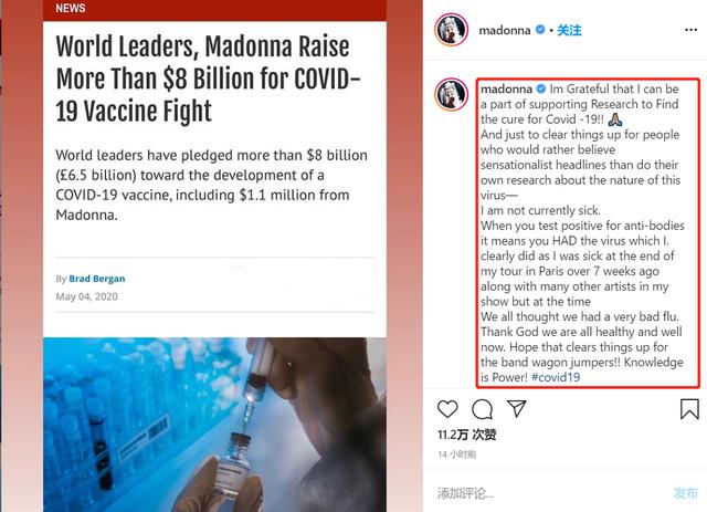 新加冕的肺炎受害者之一麦当娜也捐赠了110万美元(约780万人民币)用于相关疫苗的研发。在疫情期间,她还捐赠了大量口罩,并能够捐献。她对此非常感激和荣幸。