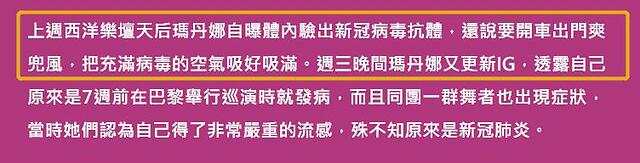 5月7日,台湾媒体报道称,7周前,欧美歌手麦当娜患了新的皇冠肺炎。所有旅行团成员都被感染了。之前,她认为引起激烈讨论的只是流