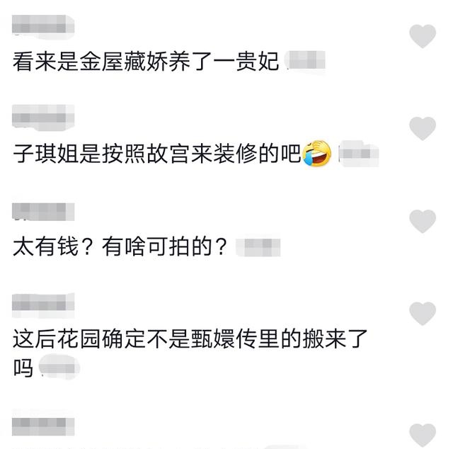 因此,许多网民评论说,赵子琪是一个真正的皇妃,她的两个女儿是公主,拿她们的后花园开玩笑,很像电视剧里的皇宫场景。然而,一些网民抱怨赵子琪伪装成炫耀自己的财富,并把自己的家装修成了故宫。