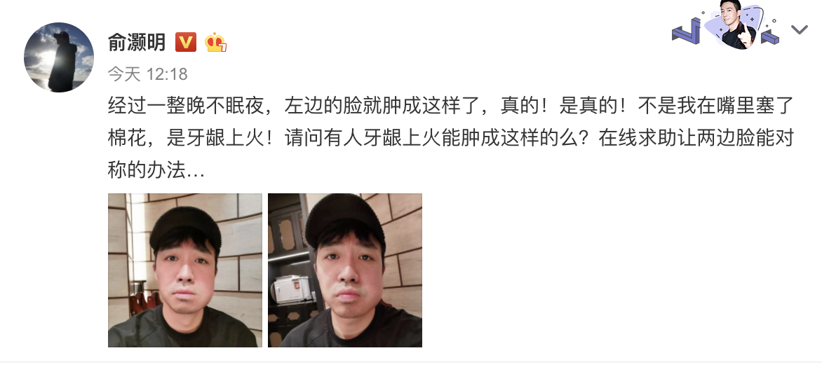 原来周东宇最近拔掉了智齿,脸肿得很厉害。她还经常在社交平台上拍照寻求帮助。