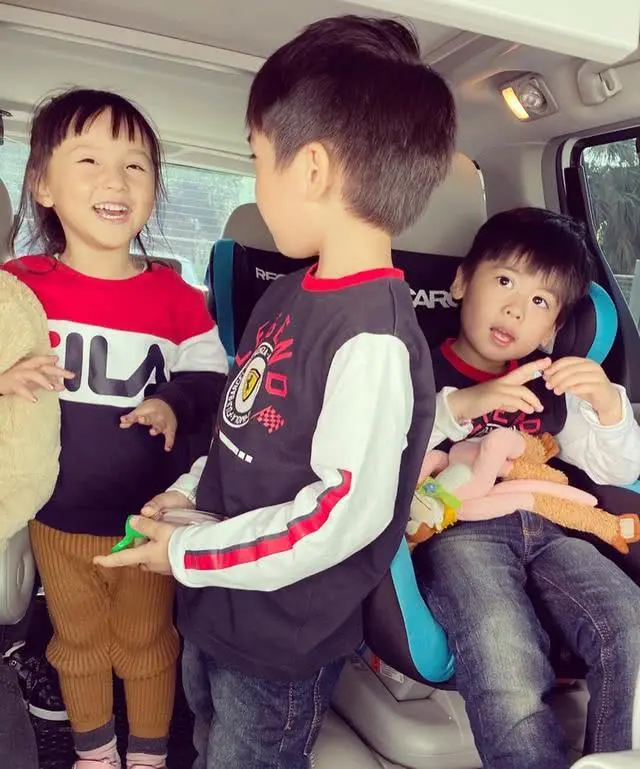 陈若仪双胞胎儿子与欧弟女儿一起玩耍。