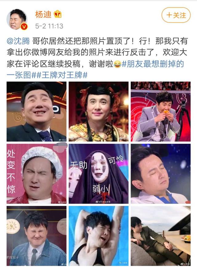 沈腾在娱乐圈也很受欢迎。5月1日,他在微博上发布了一张杨迪的丑陋照片,调侃道:“别说了,在网上很难找到你的丑陋照片。我只找到一个。"用9个正方形的表情把它包装回云,这吸引了大量的网友为申腾表情包投稿。