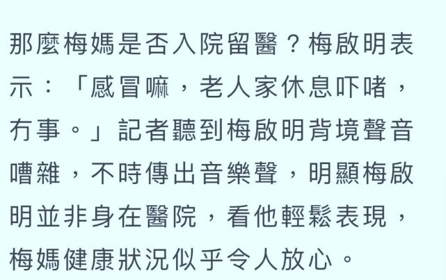 记者致电梅妈长子梅启明了解,直接问他,梅妈是不是因为心脏病入院,梅启明否认,只说是因为感冒而看医院,但记者问梅妈有没有住院时,梅启明就没有否认,只强调“没事”,老人家只是需要好好休息。