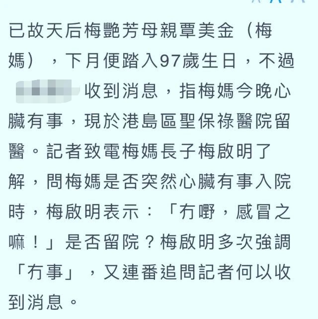 2月28日,港媒有消息指梅艳芳的妈妈突然因为心脏问题入院,不过记者联络覃美金(梅妈)唯一在世的孩子梅启明,他并没有在医院陪伴老母亲,轻松对记者表示,梅妈只是普通感冒,没有大