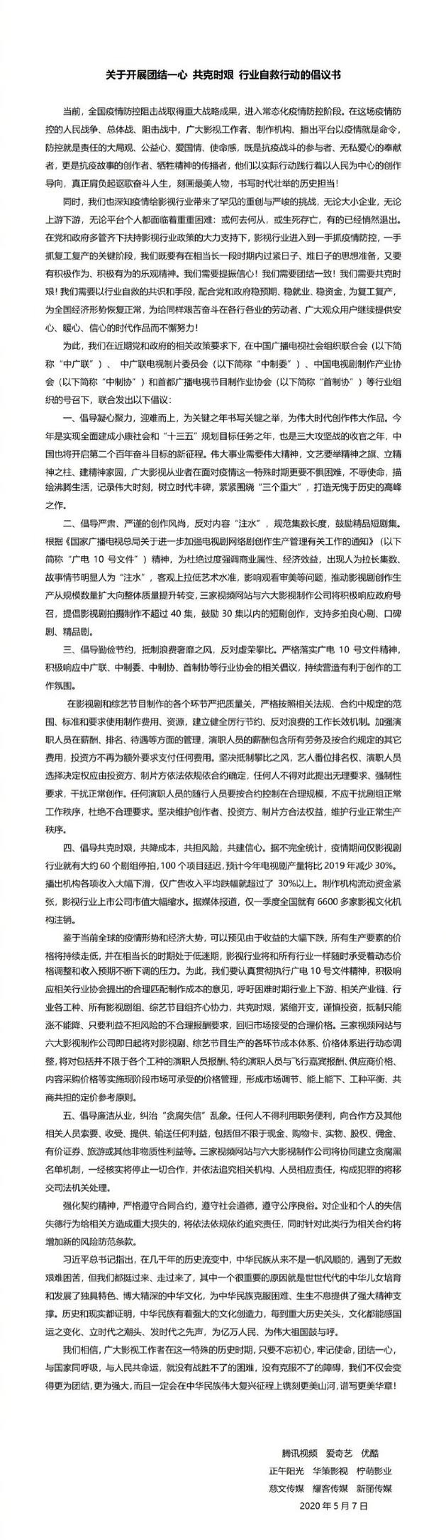 5月7日,爱奇艺、优酷、腾讯三大视频网站与《正午阳光》、《华策影视》、《李梦电影》、《辞文传媒》、《姚科传媒》、《新立传媒》六大影视制作公司联合发布了《团结共克时艰行业自救行动》提案。该提案的重点是现有电视剧的长度以及综艺节目的演员和嘉宾的报酬。