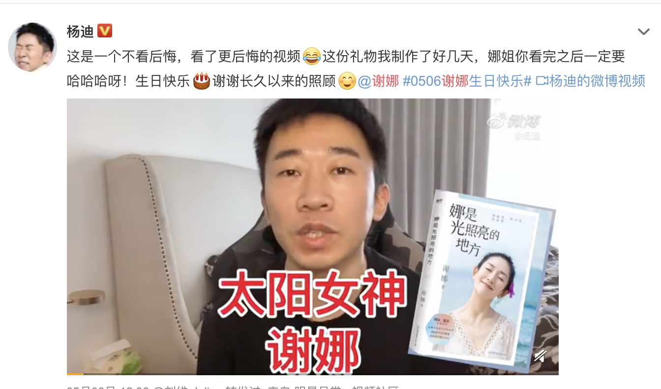 杨迪也在0点钟发布了生日视频,上演了一场模拟秀逗谢娜开心。