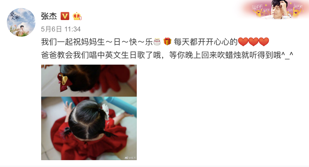 后来,张洁展示了她的双胞胎女儿的照片来庆祝谢娜的生日,并说他教过她用中文和英文唱生日歌,直到她妈妈晚上回来给她唱。