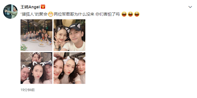 5月9日,王鸥在社交平台分享与电视剧《猎狐》演员们一起聚会的照片,配文:“‘猎狐人’的聚会,两位军君哥为什么没来,你们害怕了吗
