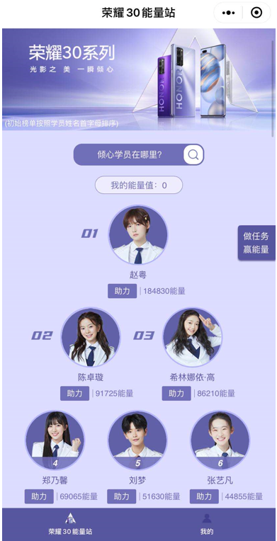 饭拍大赛活动和创造营第一期结束已近一周,但荣耀30系列应援创造营之路却从未停止。在第一期节目中,为粉丝献上绝赞创意大片的四位学员:许潇晗、林君怡、赵粤、张艺凡,如今在荣耀30能量站中榜上有名,整体人气也有很大提高。