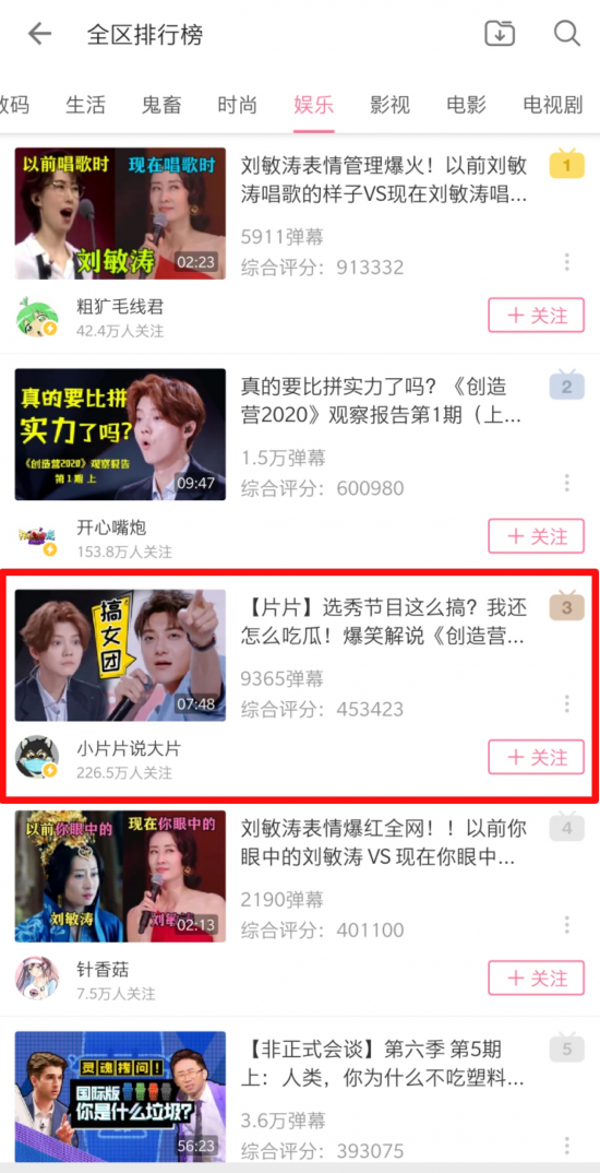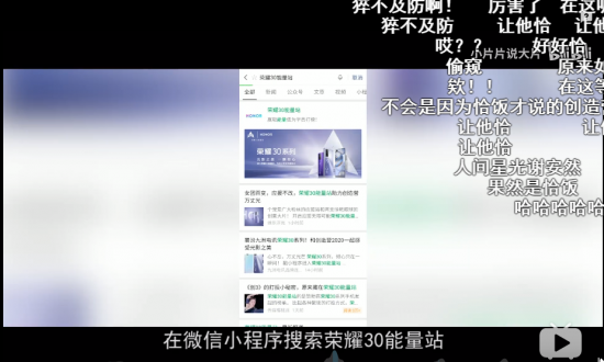前日,荣耀30还跨界联合bilibili知名影视UP主“小片片说大片” (下文简称“小片片”),共同推出了一档吃瓜点评的衍生节目——《荣耀创造营瓜田》;第一期视频推出当天播放量突破三十余万,登上娱乐榜前三名。