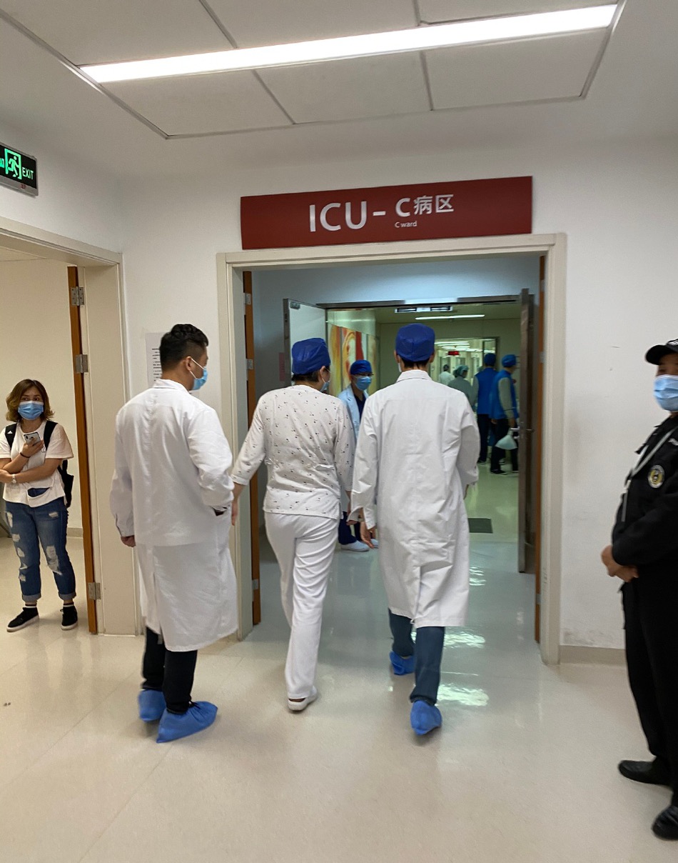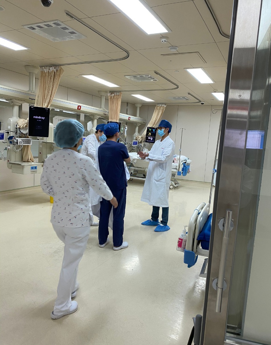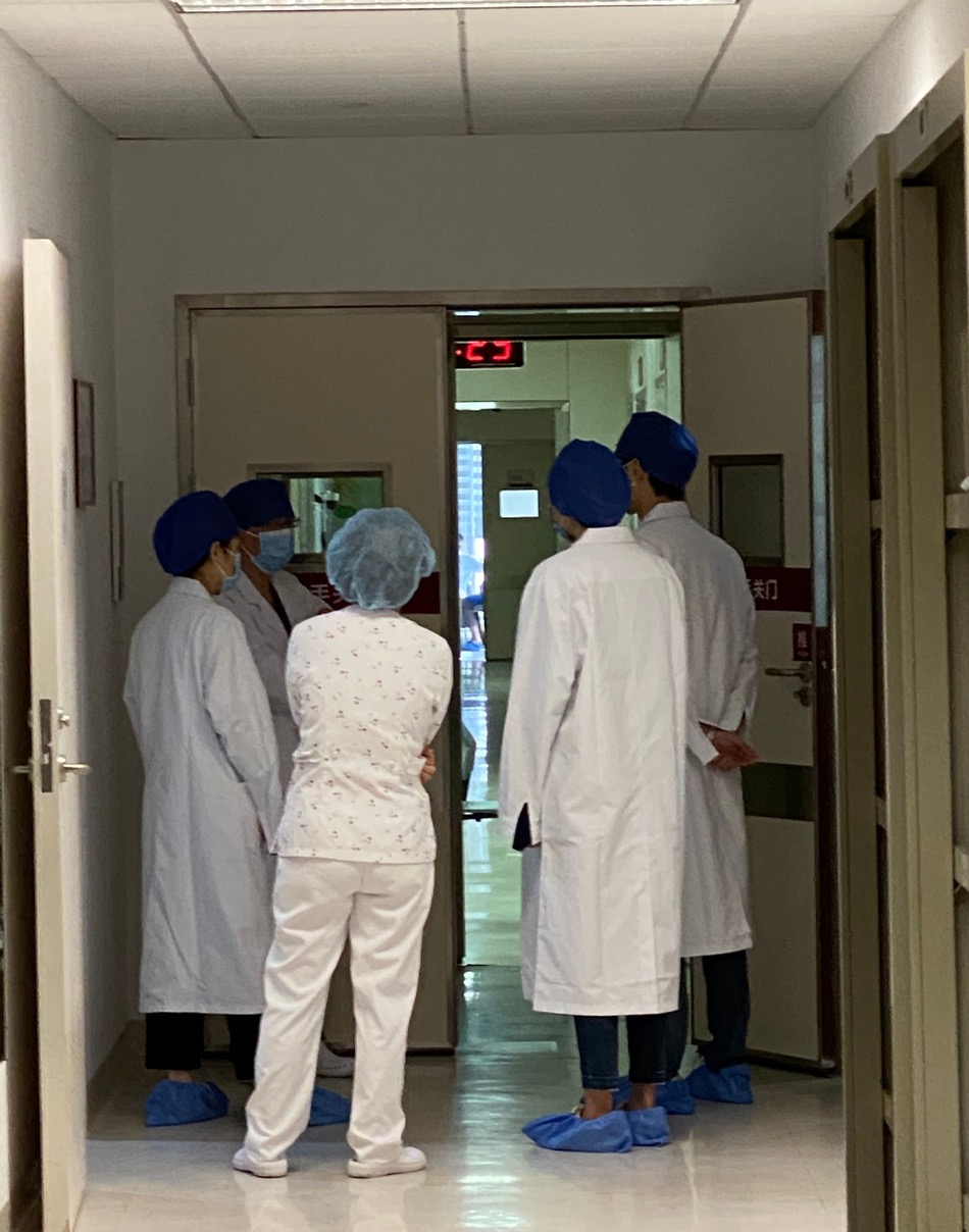 照片中,杨洋身穿白大褂戴蓝色的医用帽子和胶套,还戴了眼镜,正在跟身边的医生交谈。