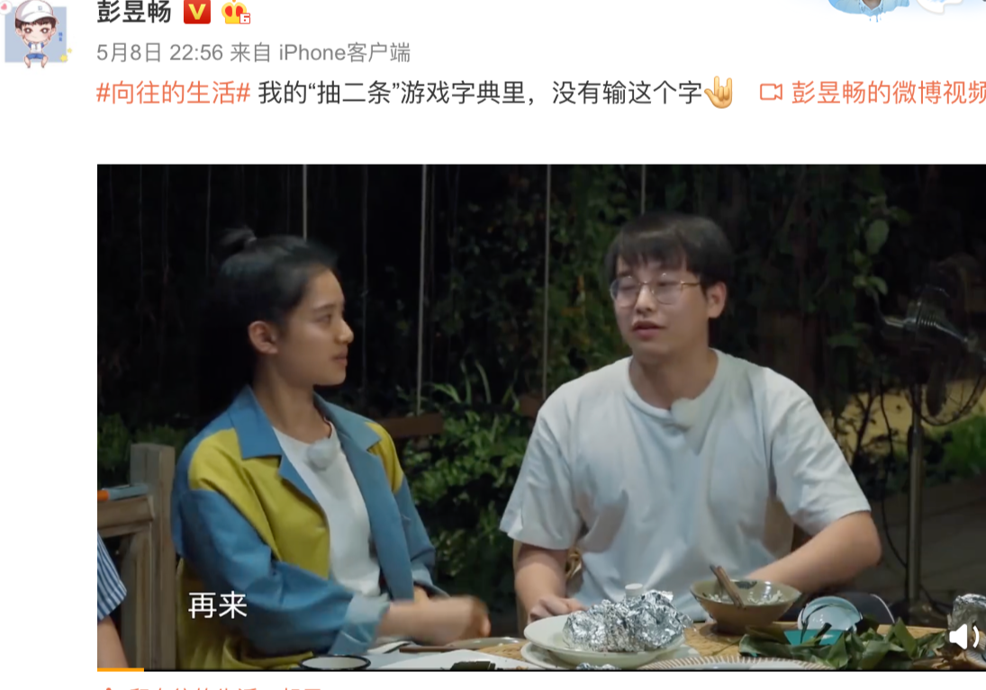 节目播出后,彭昱畅还在社交平台分享了这段视频,还骄傲地说:“我的“抽二条”游戏字典里,没有输这个字”。