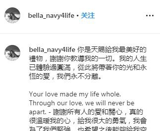 随着合照一同发出的,还有一段深情的配文,文中多次提及“转生”、“转世”、“灵魂”、“最终宿命”等词语,满是开导、鼓励人心的话语,再结合Bella痛失爱人的经历,不难看出虽然她已经很努力地想要走出来,但现在的她依旧还是难以放下那份爱。
