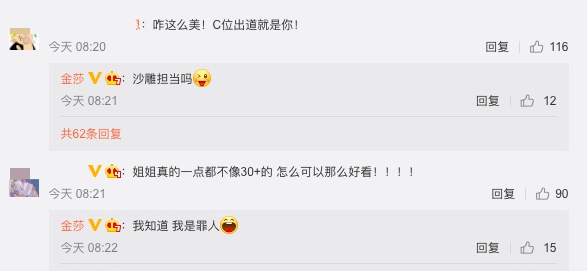 有网友在评论区留言:“咋这么美!c位出道就是你!” 金沙搞笑回复道:“沙雕担当吗” 。随后还有网友评论她:“姐姐真的一点都不像30+的,怎么可以那么好看!” 金沙面对网友的彩虹屁,超自信地回应道:“我知道,我是罪人”。