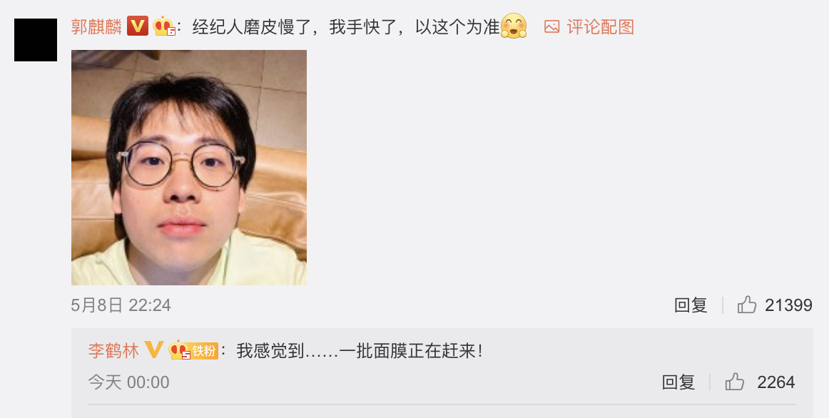 随后,德云社演员李鹤林评论道:“我感觉到……一批面膜正在赶来!”据悉,近日郭麒麟参加《拜托了冰箱》,在节目中“拉赞助”,竟然收获了25年的视频会员,和各大平台的外卖会员。