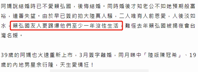5月9日,据港媒报道,阿娇和赖弘国离婚的消息传出后,关于两人更多的爆料被挖出,两人离婚其实早有预兆,更有好友曝出两人至少一年没有同房,可见互相之间的关系早已破