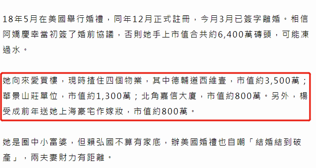 阿娇很早就有“圈中小富婆”的称号,向来爱买楼的她拥有多个物业,每一个都是价值千万,最贵的高达3500万,手握六千万的她实力可见一斑,但医生出身的赖弘国就没这么富裕了,好在两人结婚前就签订协议,阿娇的财产并没有因为离婚而有影响。