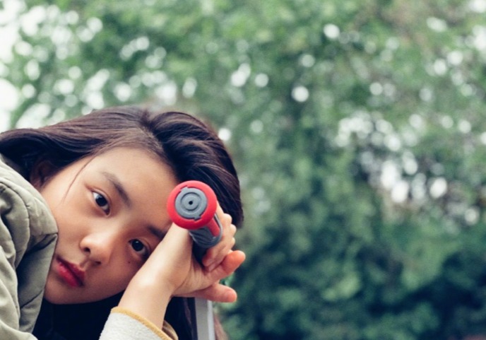 另外一张照片中,多多双手扶着滑板车扶手,脑袋贴在手臂上,一头浓密的秀发垂下来,虽然没有笑容,但依然漂亮,些许的忧郁更显可爱。