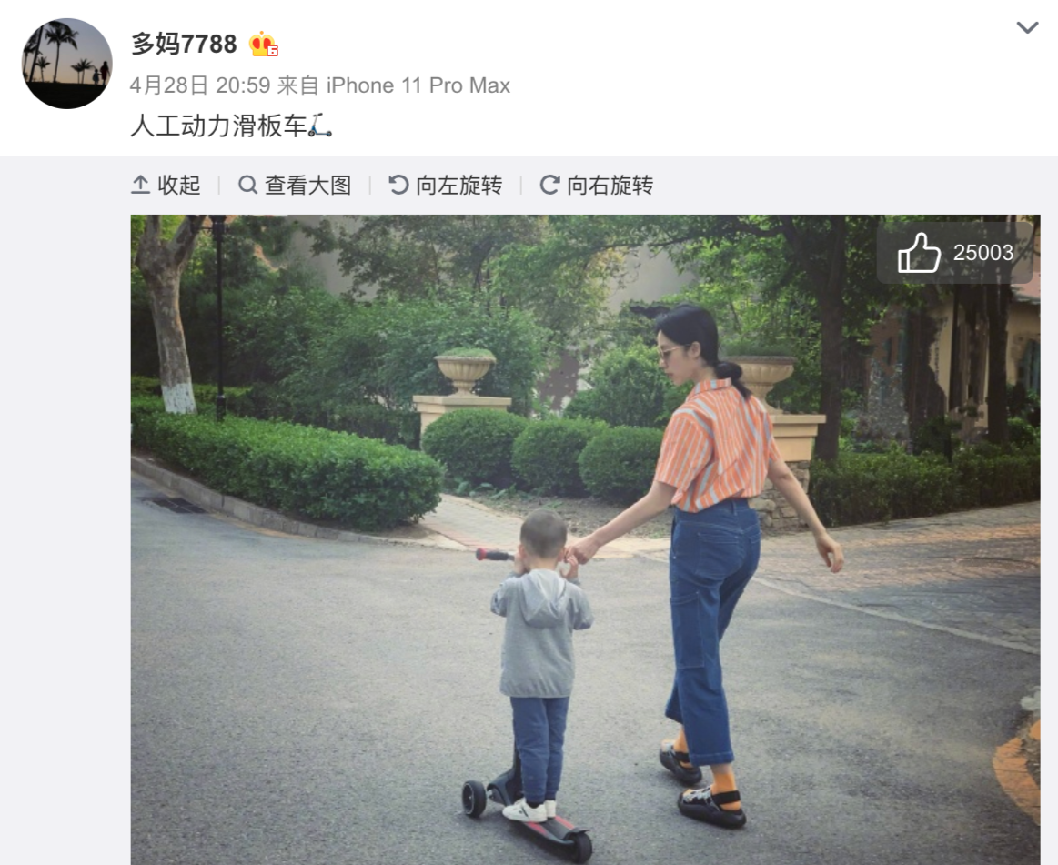 5月8日晚,孙莉在社交平台晒出多多和弟弟一起玩滑板车的背影照片,并配文写道:“每天固定饭后运动。”