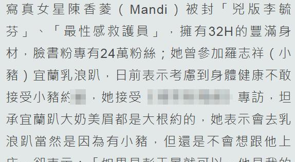 据悉,陈香菱因为丰满性感的身材在网络走红,目前拥有24万粉丝,她承认曾参加韩国天团的派对,进入后手机要被没收,现场不允许拍照。