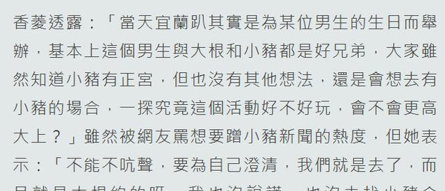 陈香菱再三强调,当天没有和小猪发生什么,她们参加派对是大根约的,她没有说谎,也没有和小猪合照。