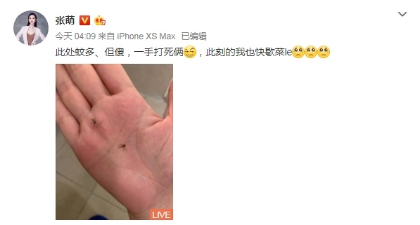 早些时候,同样参加该节目录制的演员张萌、金晨等也在社交平台发文。张萌称“此处蚊多、但傻,一手打死俩,此刻的我也快歇菜le”,还配上了忧伤的表情,而就连从小习舞的金晨都表示“累到不想劈叉”。