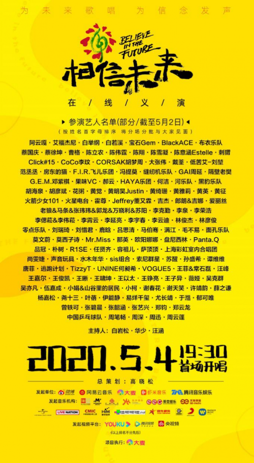 20日下午4点44分,取了五线谱里“4”的谐音“发发发”,“相信未来”义演倡议书正式发布。不到24小时,这场中国音乐史上最大的在线义演正式进入落地阶段。
