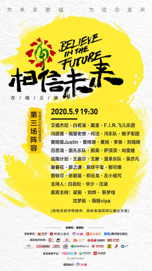 5月8日,相信未来义演组委会官宣,网易云音乐等平台将在5月9日19:30正式播出相信未来义演第三场。第四场上线时间可能排在10日,连演两