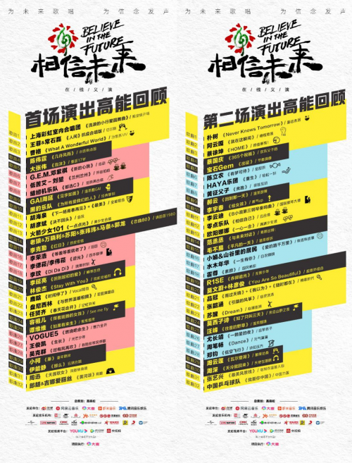 接连两场演出,共有65组音乐人带来精彩表演。“相信未来”义演活动,以"对抗焦虑,回归日常"为主题,演出形式不拘一格,每位明星都以独特的方式呈现了精彩的表演,一起为未来歌唱,为信念发声,用音乐的力量安抚心灵。