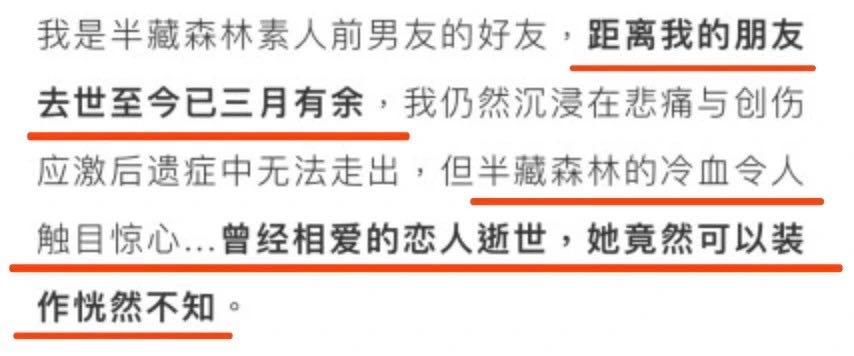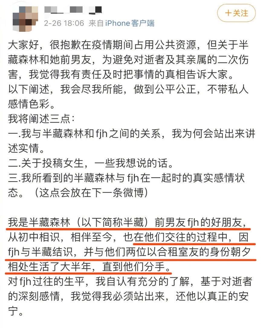 网曝半藏森林间接害死前男友、逝者熟人称半藏与此事无关,网友问题更大。网友身份成谜,可能是F的潜在暧昧对象、爆料者回应身份谜团。逝者熟人再度锤爆料者,称其消费F。