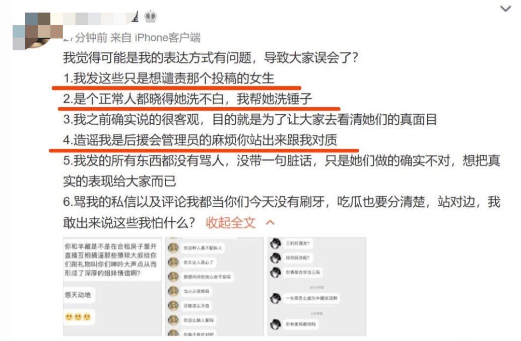 果然没过多久,芒果的身份和立场遭到了质疑。最早爆料的当事人表示她是半藏后援会的管理员,自然要为正主洗地。