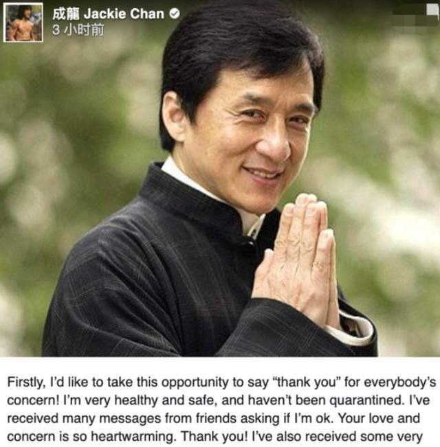 近日,还有网友造谣成龙患病被隔离,也是让不少粉丝们很担心。不过很快成龙大哥就出来辟谣,一方面是避免造谣者逍遥法外,一方面是顾虑粉丝们会担心,所以成龙也是在自己的社交网站发英文解释:自己没生病,没隔离。