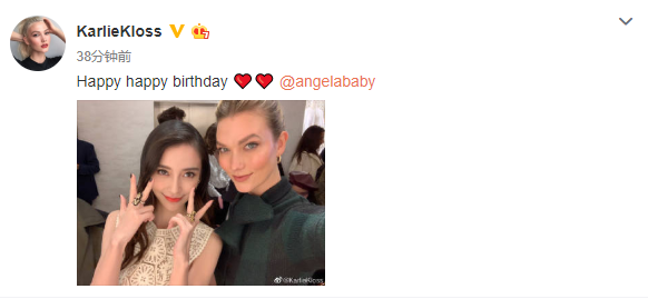 2月28日是Angelababy的30岁生日,28日上午,超模Karlie Kloss在社交平台上分享了一张与ababy的合影为其庆生,并配文:“Happy happy birthday。”