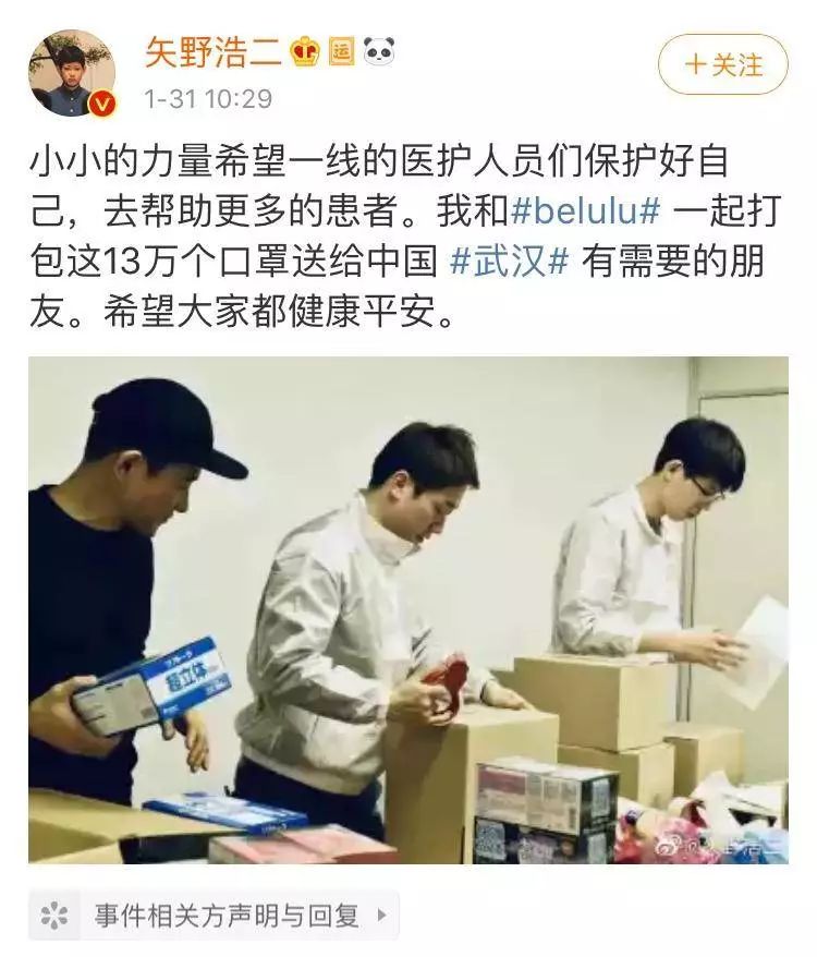 据了解,1月31日,矢野浩二透露,他亲力亲为打包了13万个口罩送给中国武汉有需要的人。“300个一套,500个一套,装满了500个纸箱子”。他希望在一线的工作人员能保护好自己,帮助更多的患者,并希望大家都平安。
