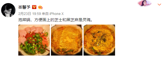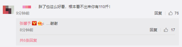 张馨予年前拍摄的两部电视剧都已经杀青,近期一段时间宅在家里天天琢磨厨艺,甚至变成了美食博主,时不时上线打卡自己做的美食,然后成功胖到了110斤。粉丝看到张馨予晒出的自拍夸她一点看不出来有110斤,张馨予“谢谢”两字前面的省略号就能想象到她有多无奈,粉丝和偶像之间还真是相爱相杀。