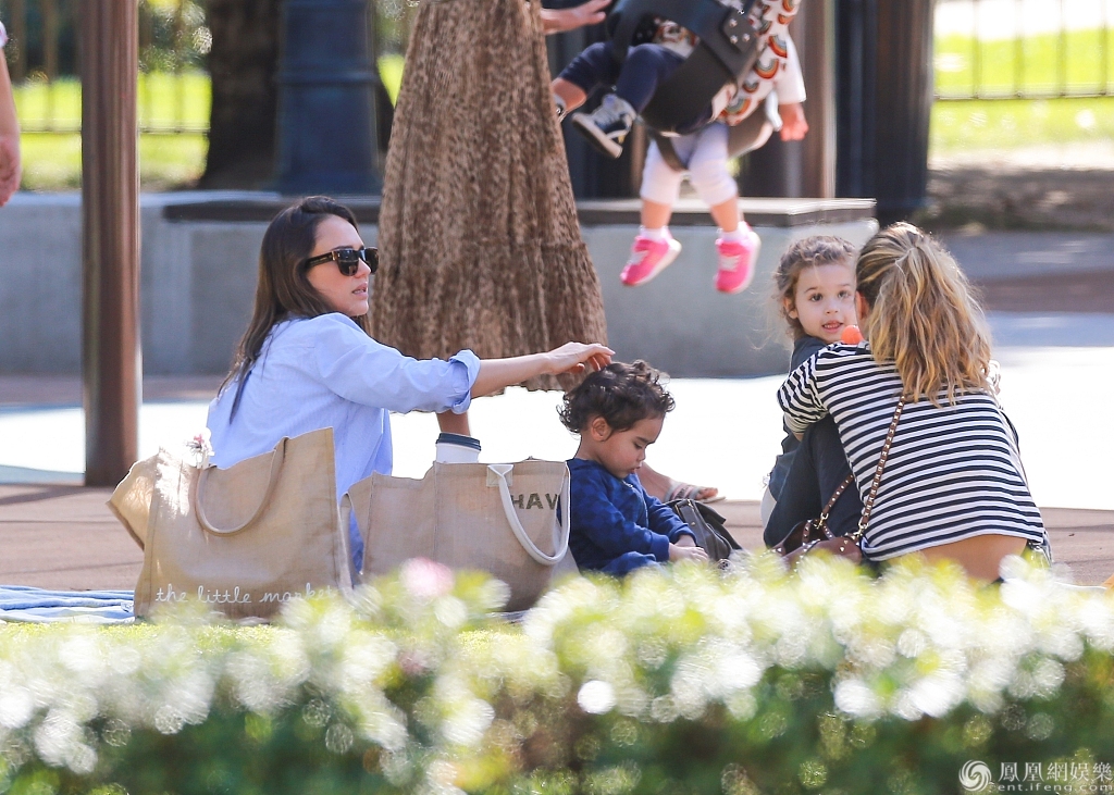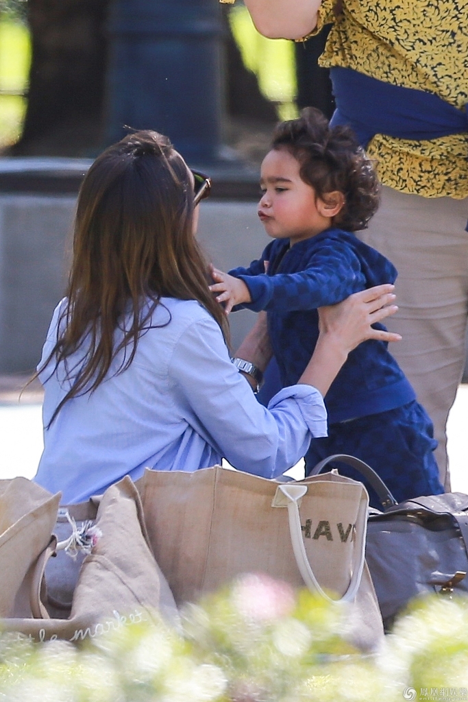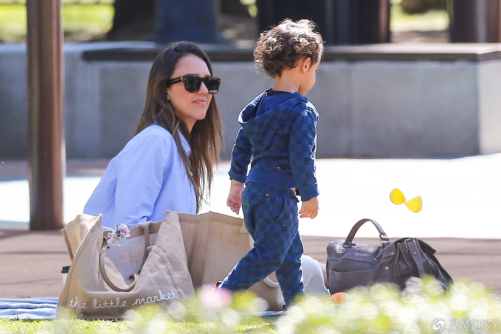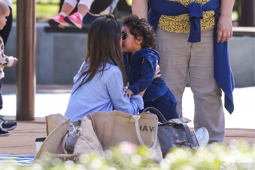 杰西卡与儿子外出野餐玩亲亲抱抱。