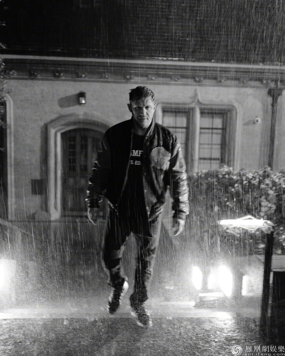 在最新发布的片场剧照中,汤姆·哈迪一身夹克长裤搭配在雨中现身,表情凝重似乎是在拍摄一场重要的雨中戏份。在片中饰演“屠杀”的伍迪·哈里森也在片场亮相,照片中二人的亲密合影,看来虽然在电影中“毒液”和“屠杀”是命中注定的对手,但在戏外他们却相处十分融洽,这让广大影迷也愈加期待在大银幕上看到两人的“相爱相杀”的精彩对决。现场照片由摄影师Greg Williams拍摄,黑白风格的片场剧照也为电影的暗黑英雄风格带来了一丝神秘刺激的氛围。